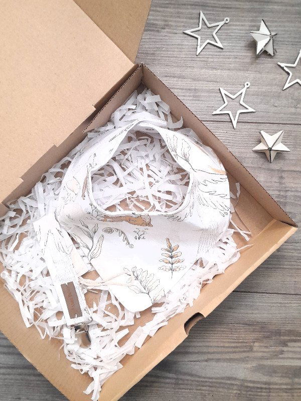 • Babero de vestir de gabardina de algodón estampada, y tusor liso del lado de atrás. No tiene capa plástica. Con broche a presión metálico.
