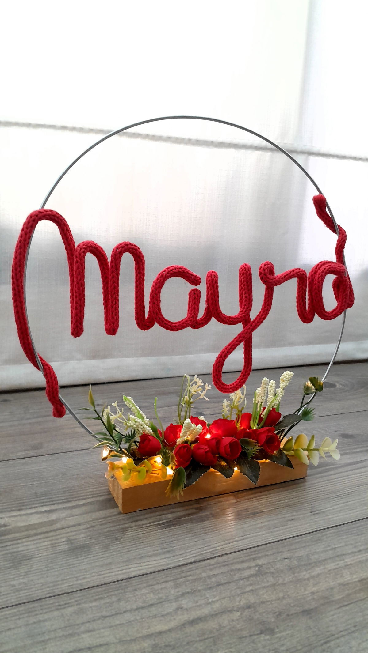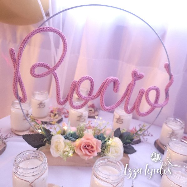Nombre de alambre forrado, en aro metálico de 30 cm.