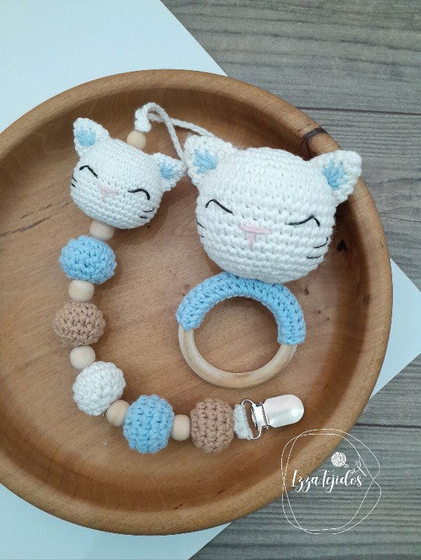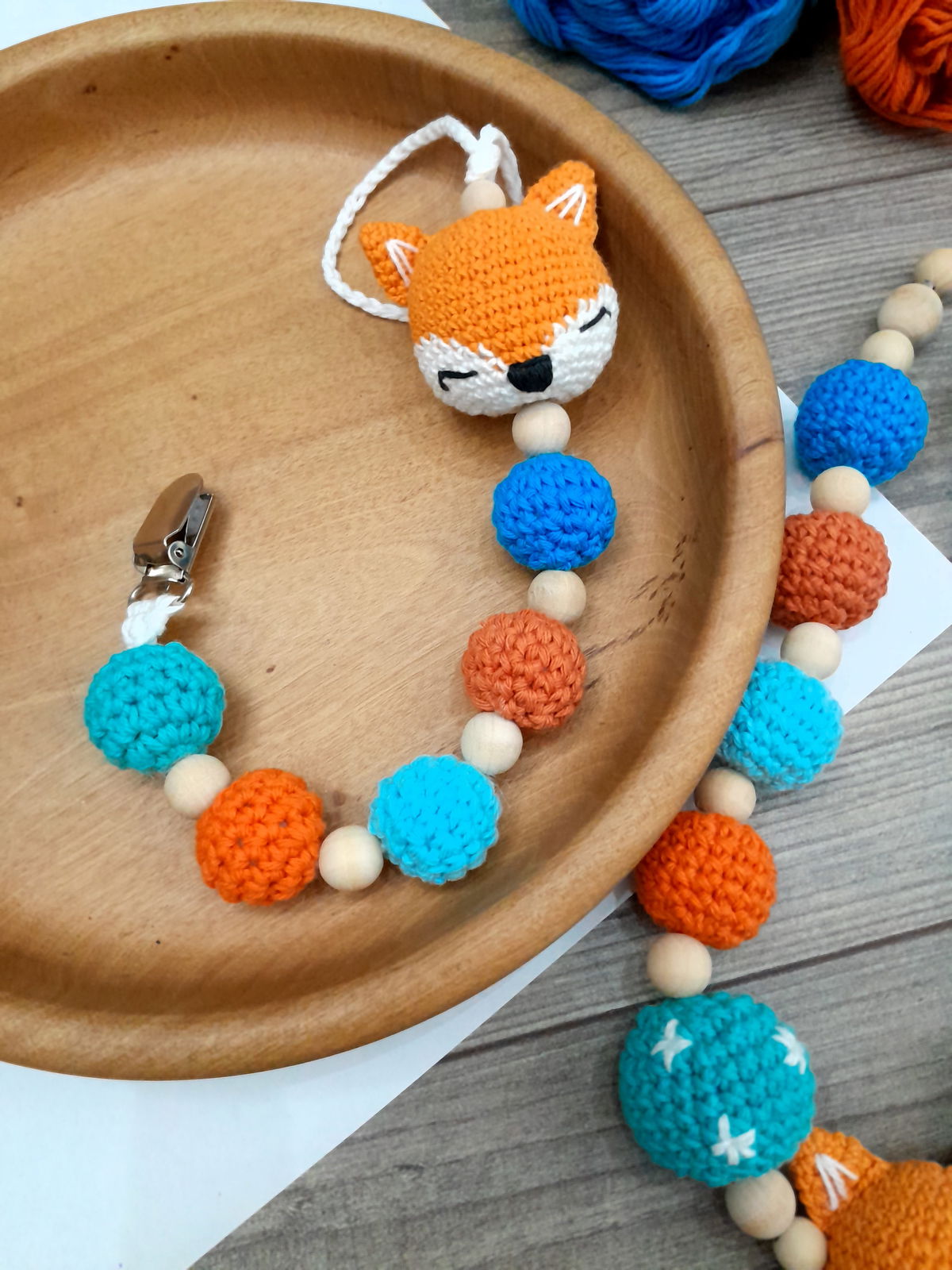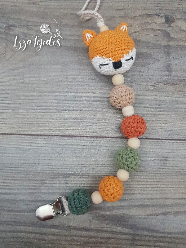 Portachupete con zorrito y pelotitas tejidas, con detalle de cuentas de madera.