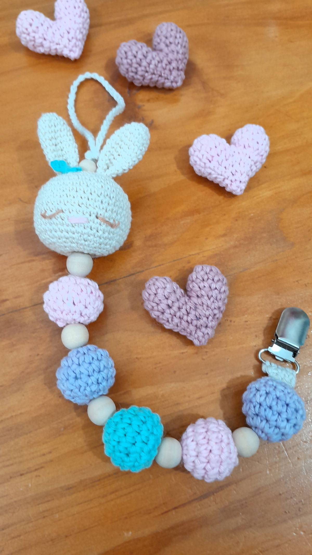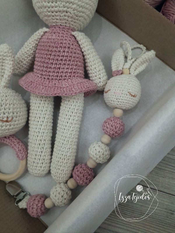 Realizado en hilo de algodón. Relleno de vellón siliconado. Cuentas de madera natural.