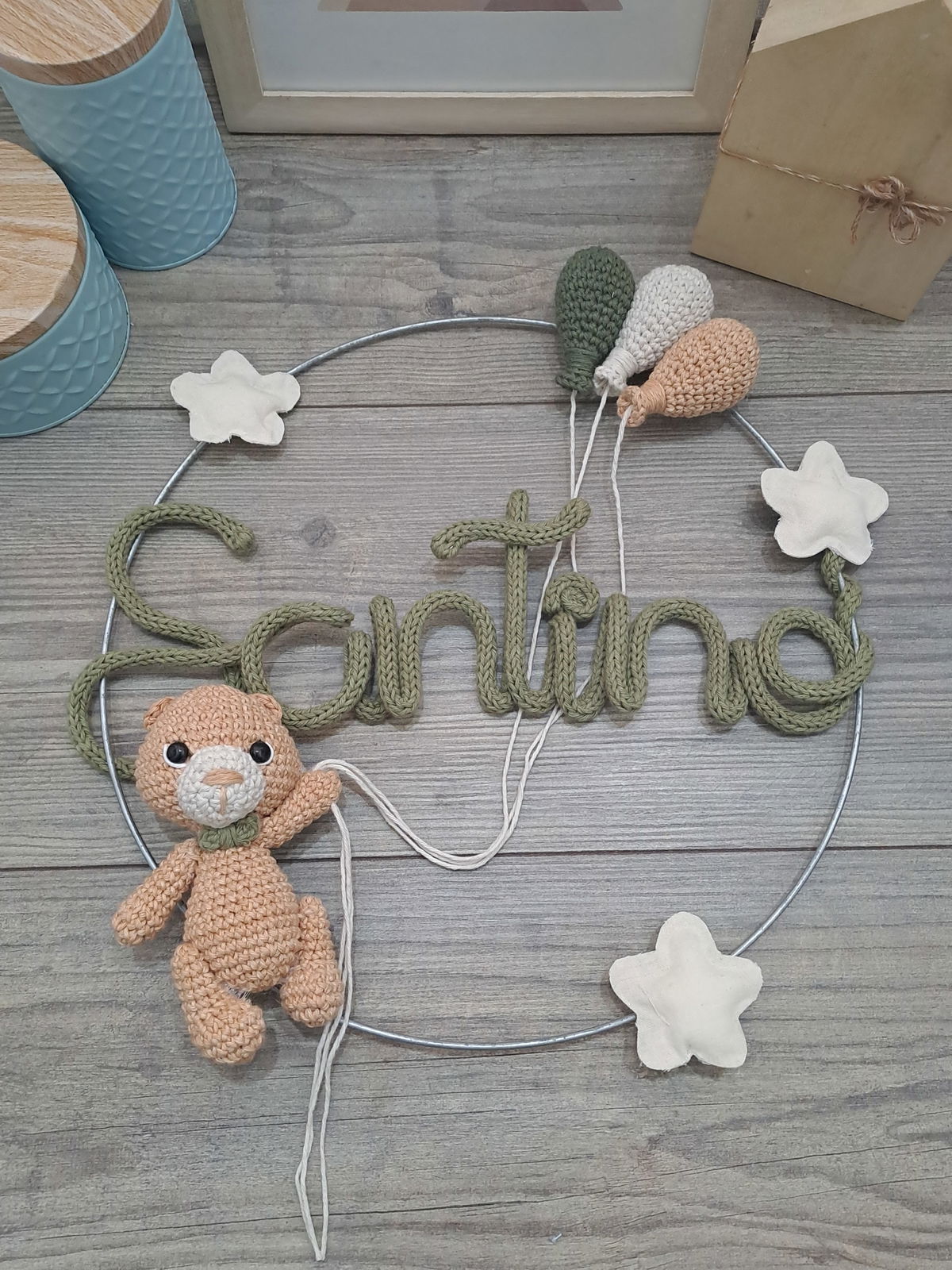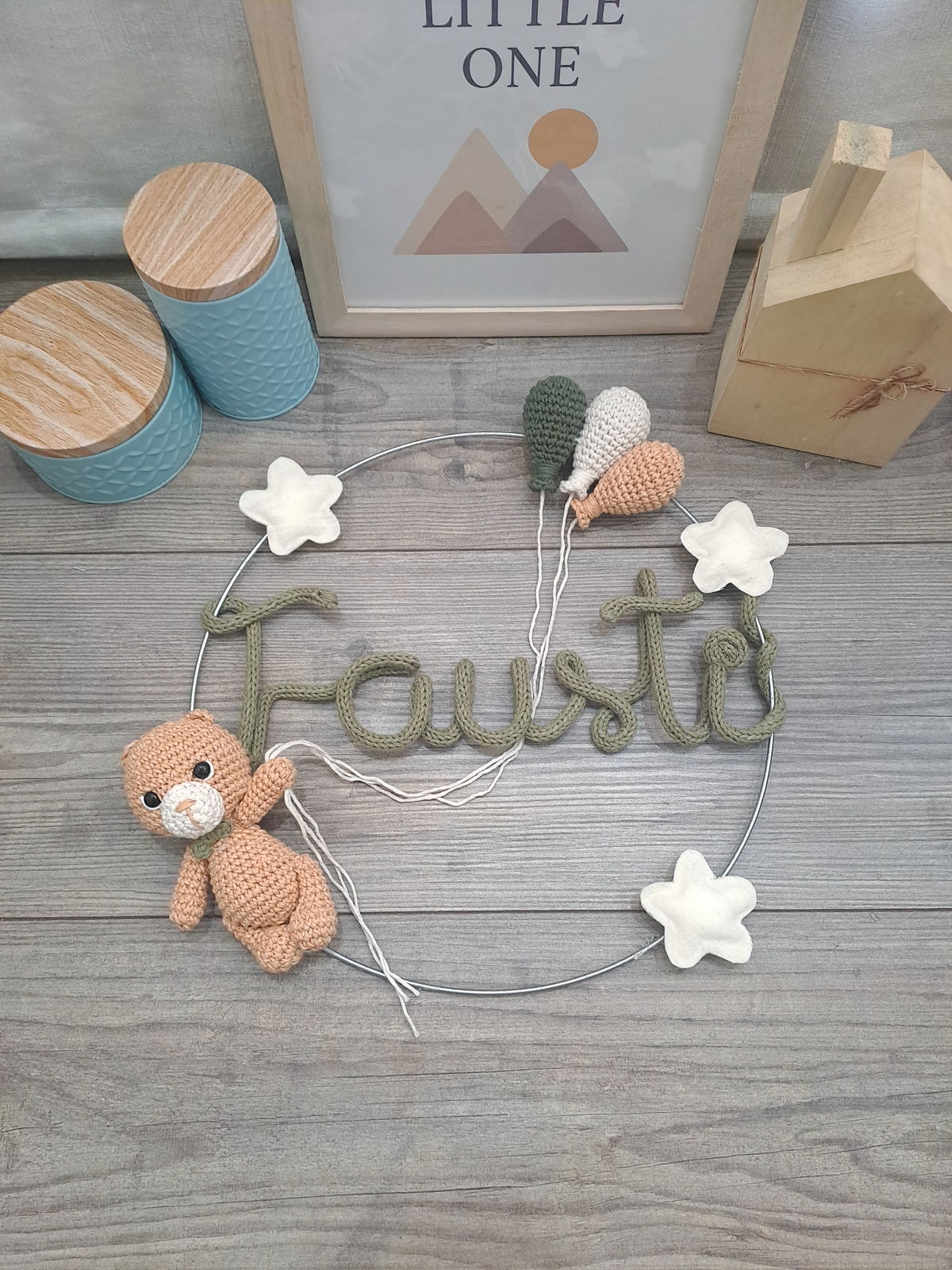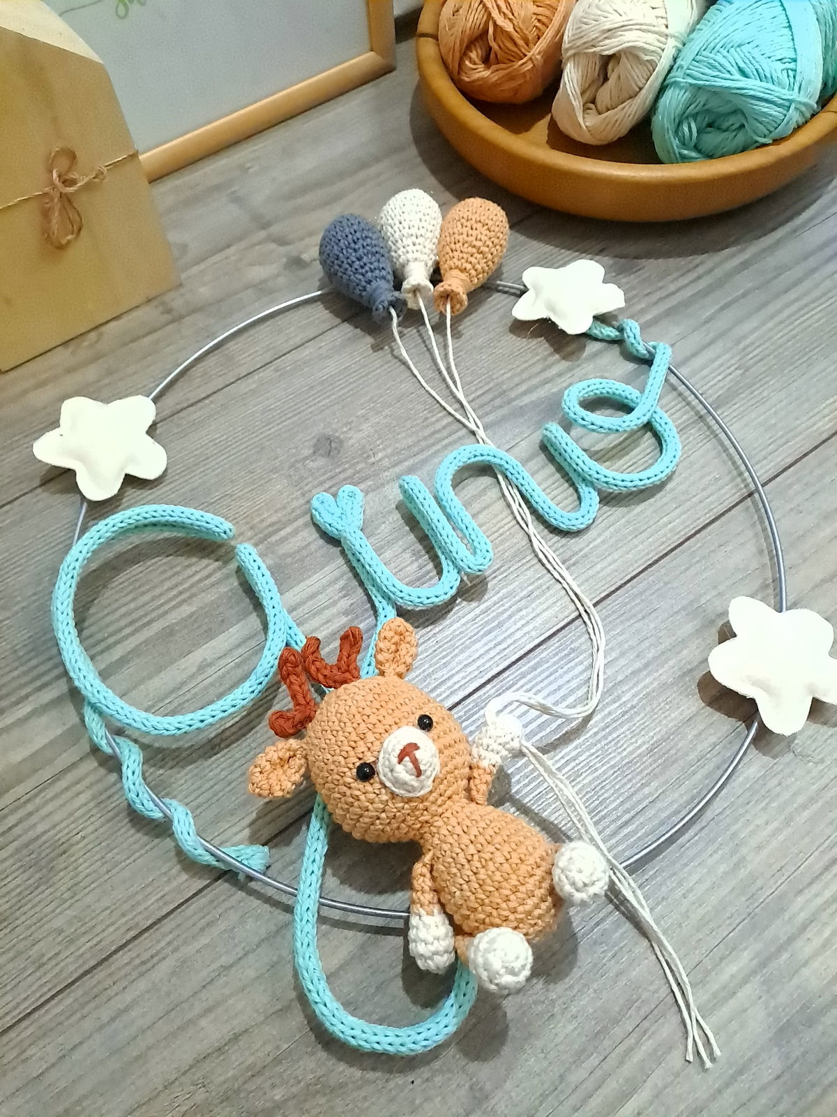 Colores a elección. Para las estrellas los colores disponibles son: verde agua, celeste, natural, rosa bebé, fucsia, amarillo patito, turquesa o violeta.