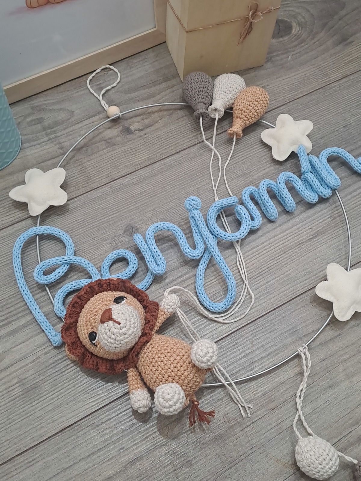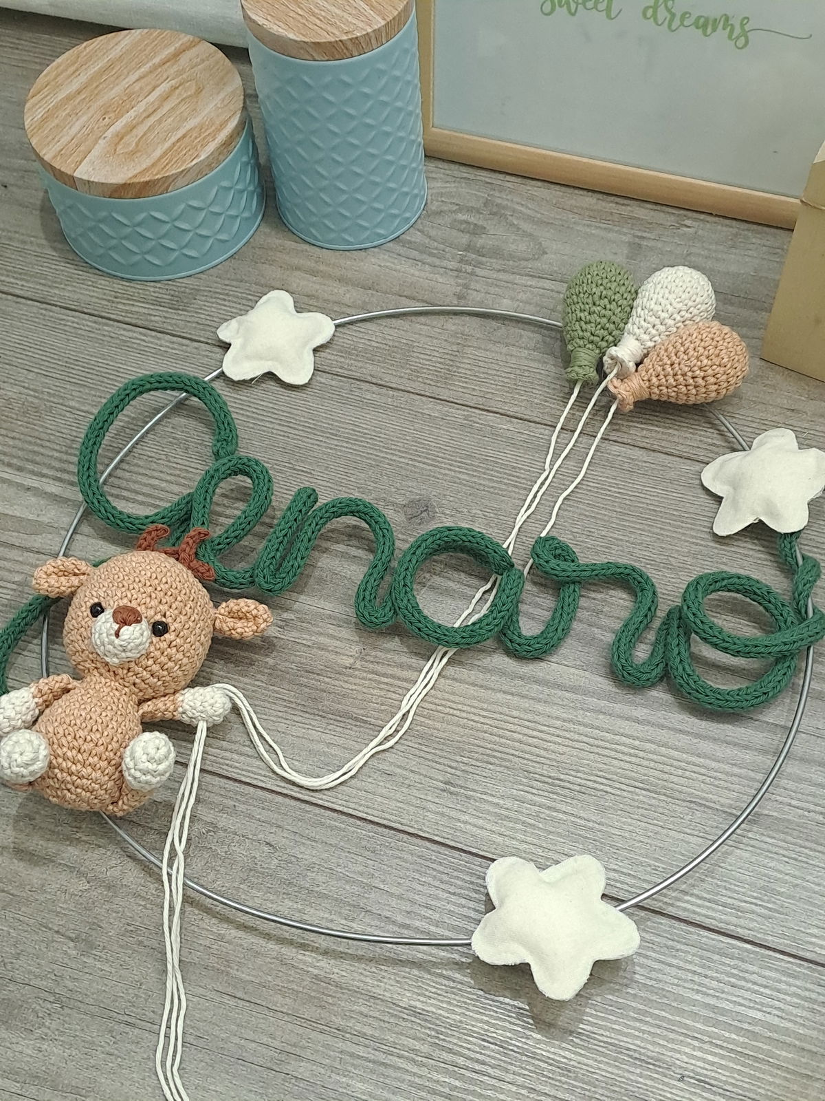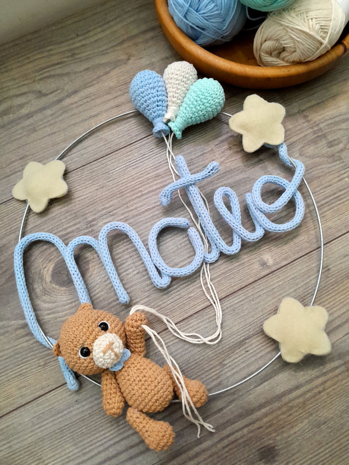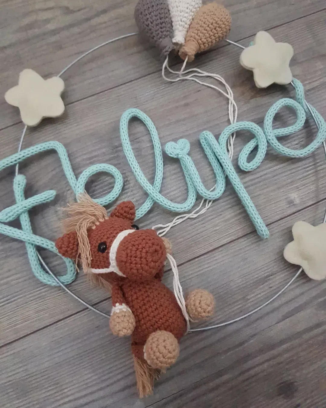 Colores a elección. Para las estrellas los colores disponibles son: verde agua, celeste, natural, rosa bebé, fucsia, amarillo patito, turquesa o violeta.