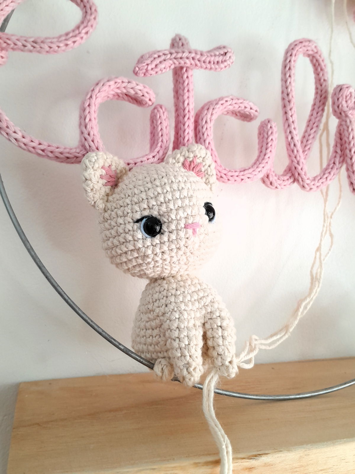 Nombre de alambre forrado, en aro metálico.