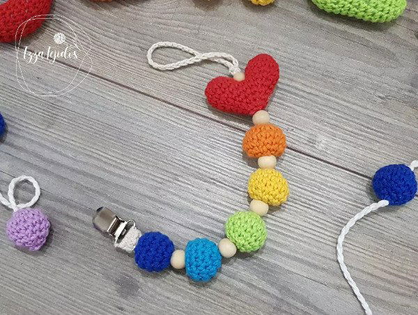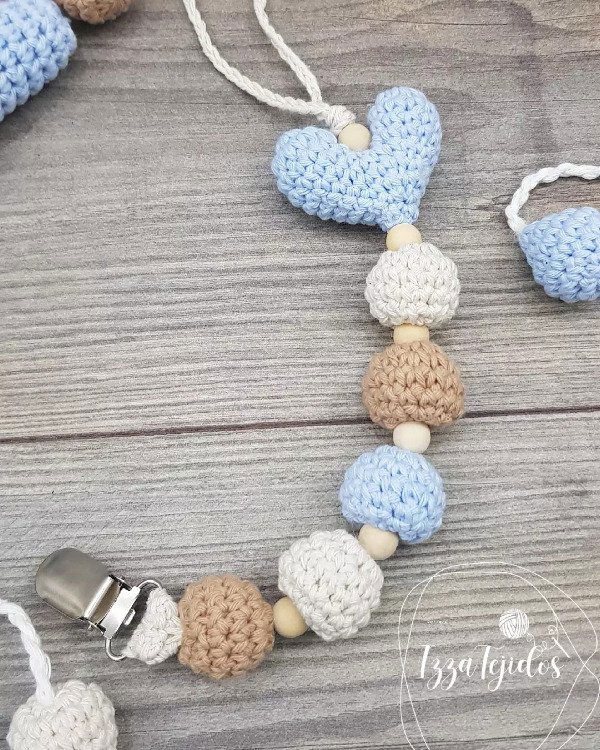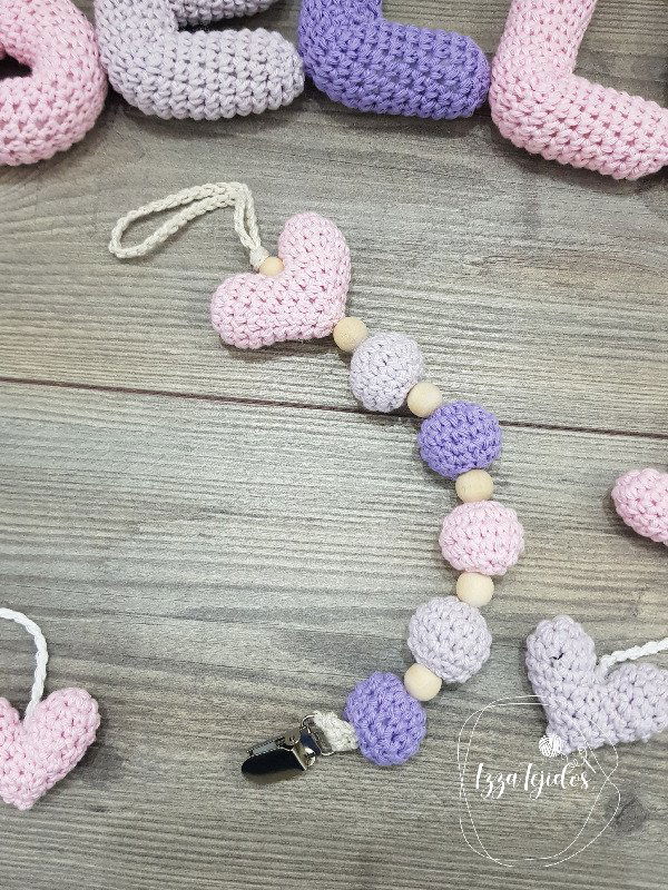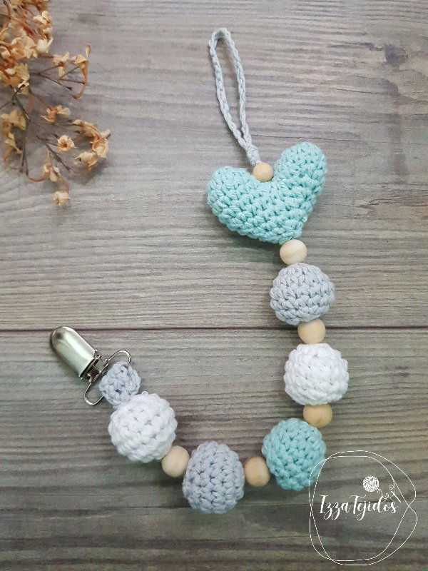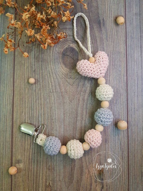 Portachupete con corazón y pelotitas tejidas, con detalle de cuentas de madera.
