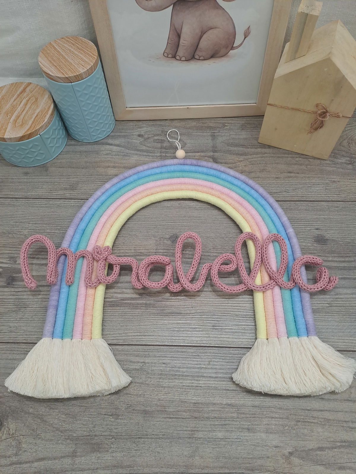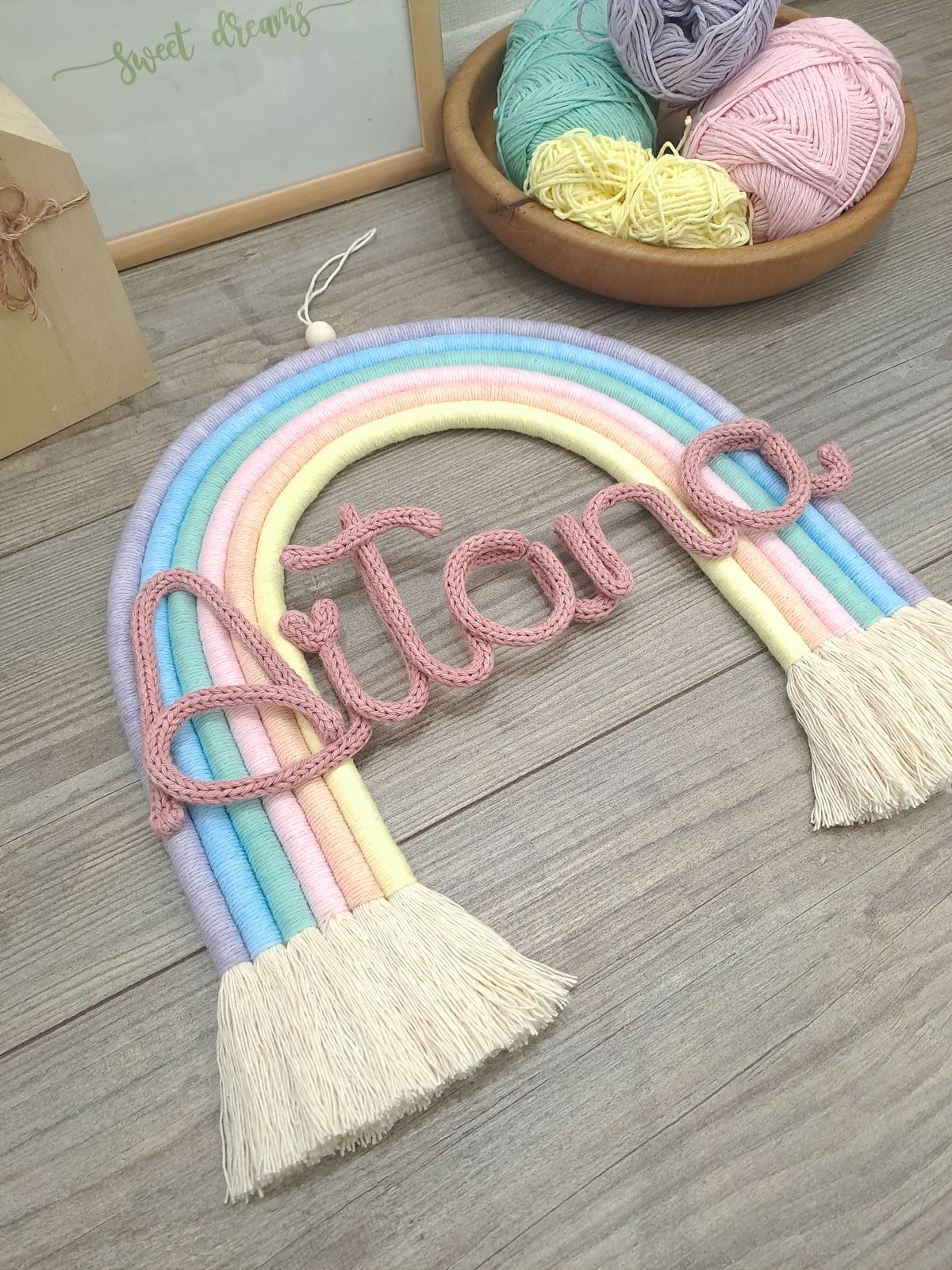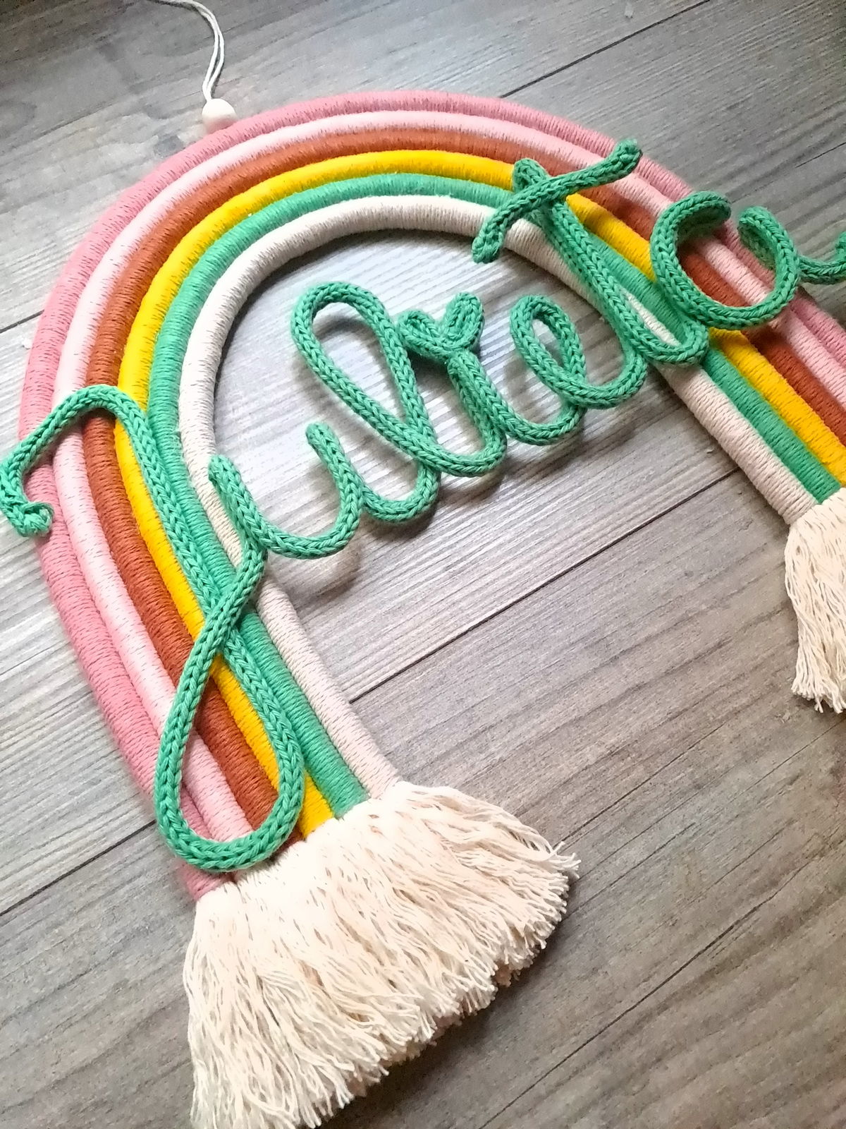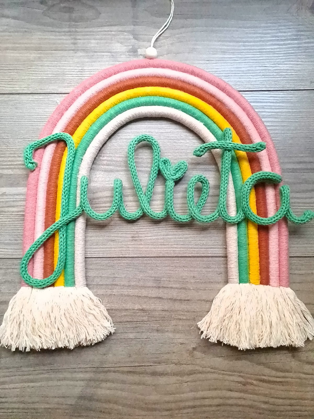 Arcoiris de 6 colores, con nombre de alambre forrado en cordón tejido.