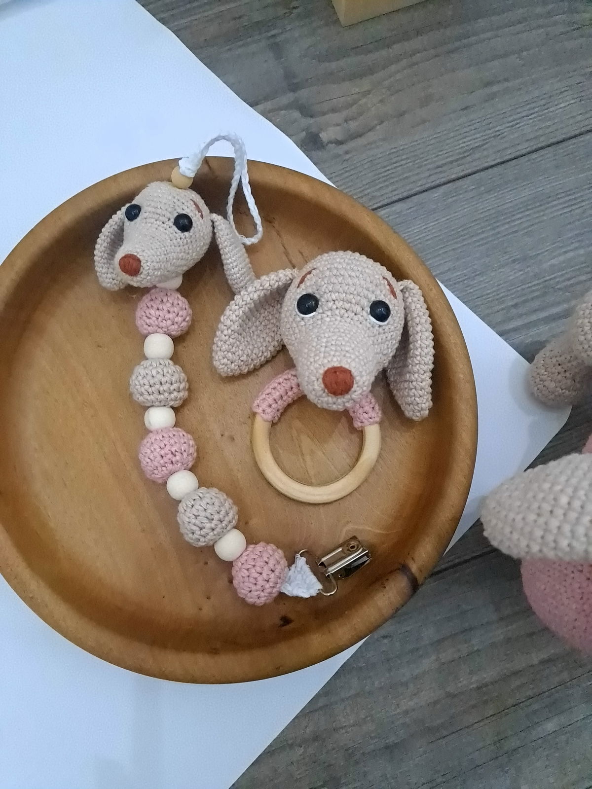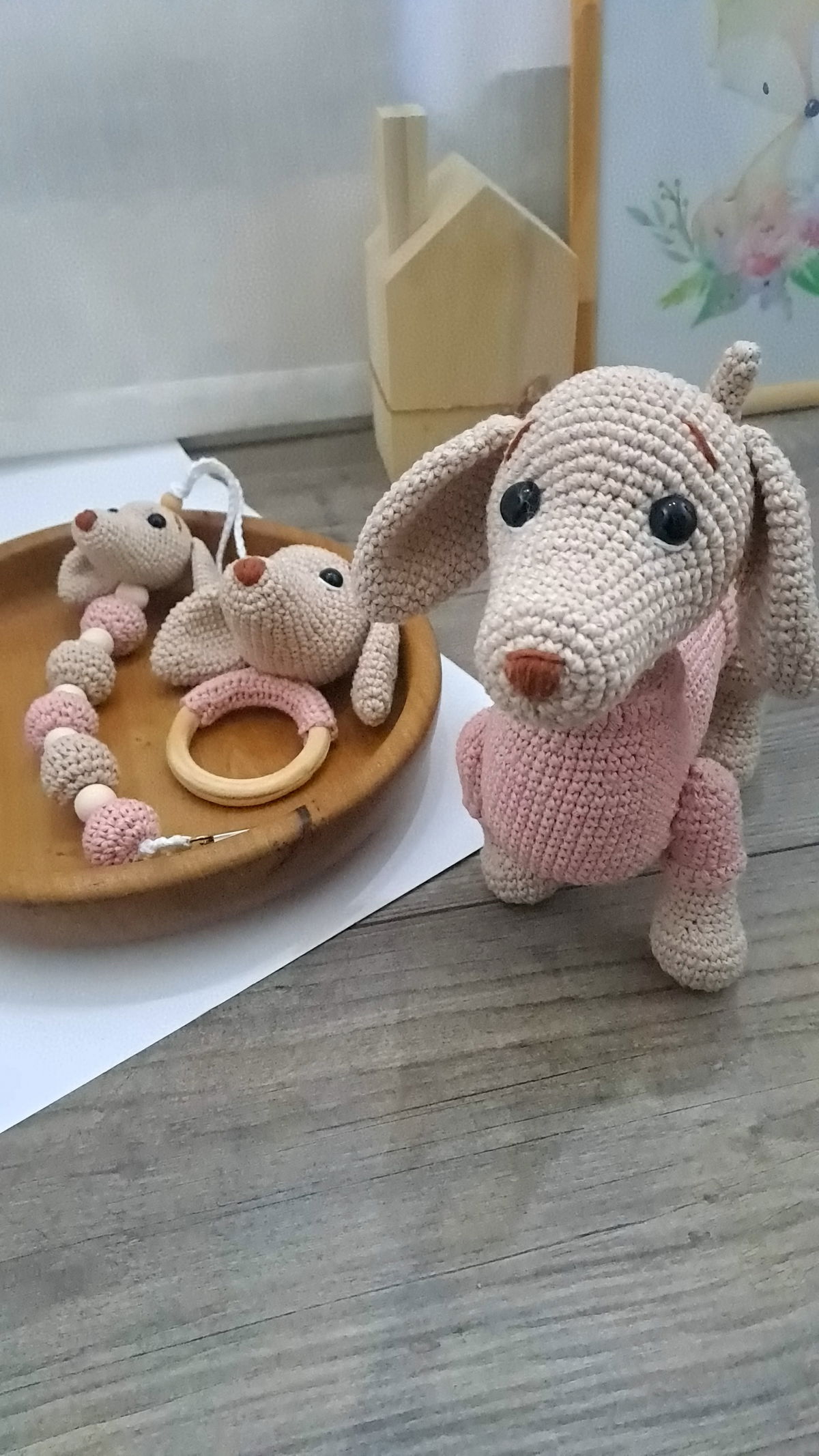 Set Perrito Salchicha: amigurumi + sonajero + portachupete