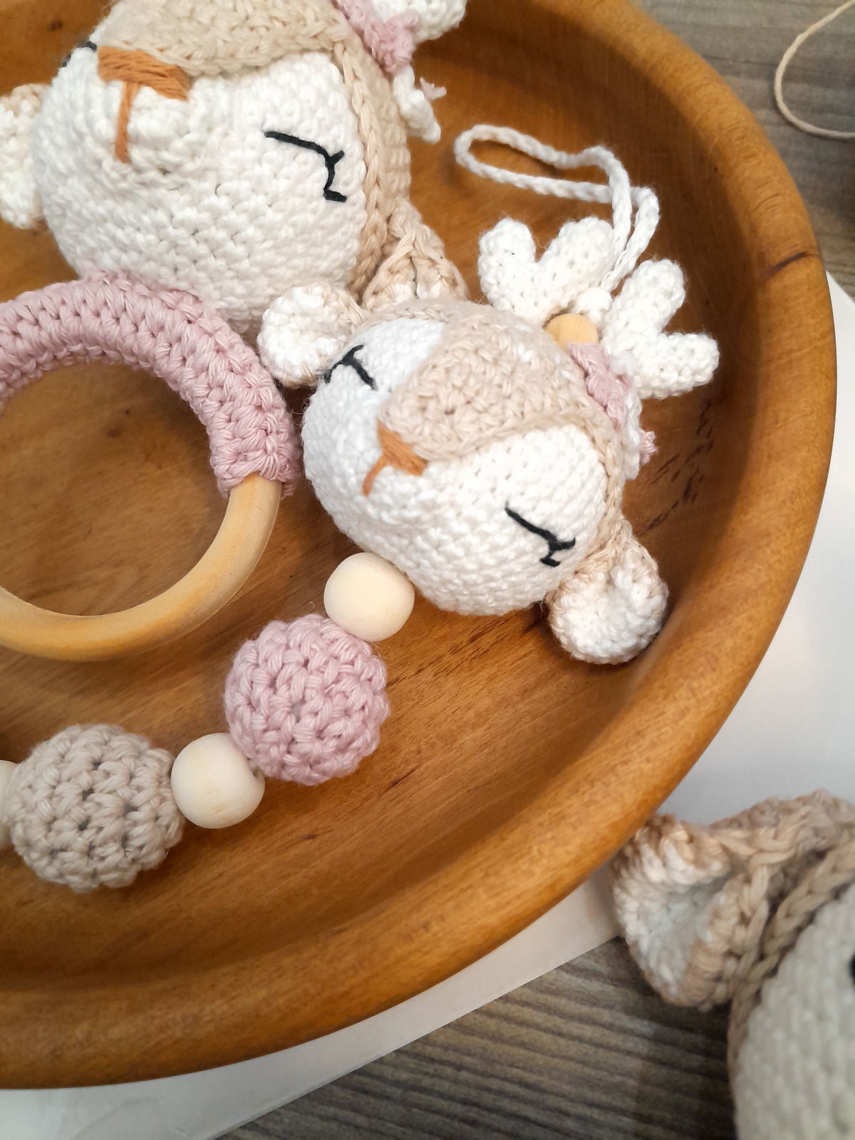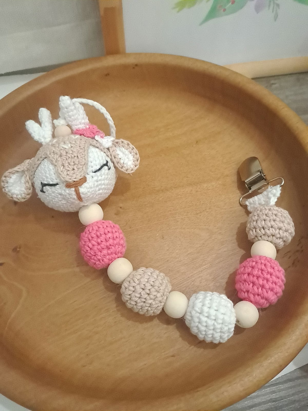 Portachupete con Ciervita y pelotitas tejidas, con detalle de cuentas de madera.