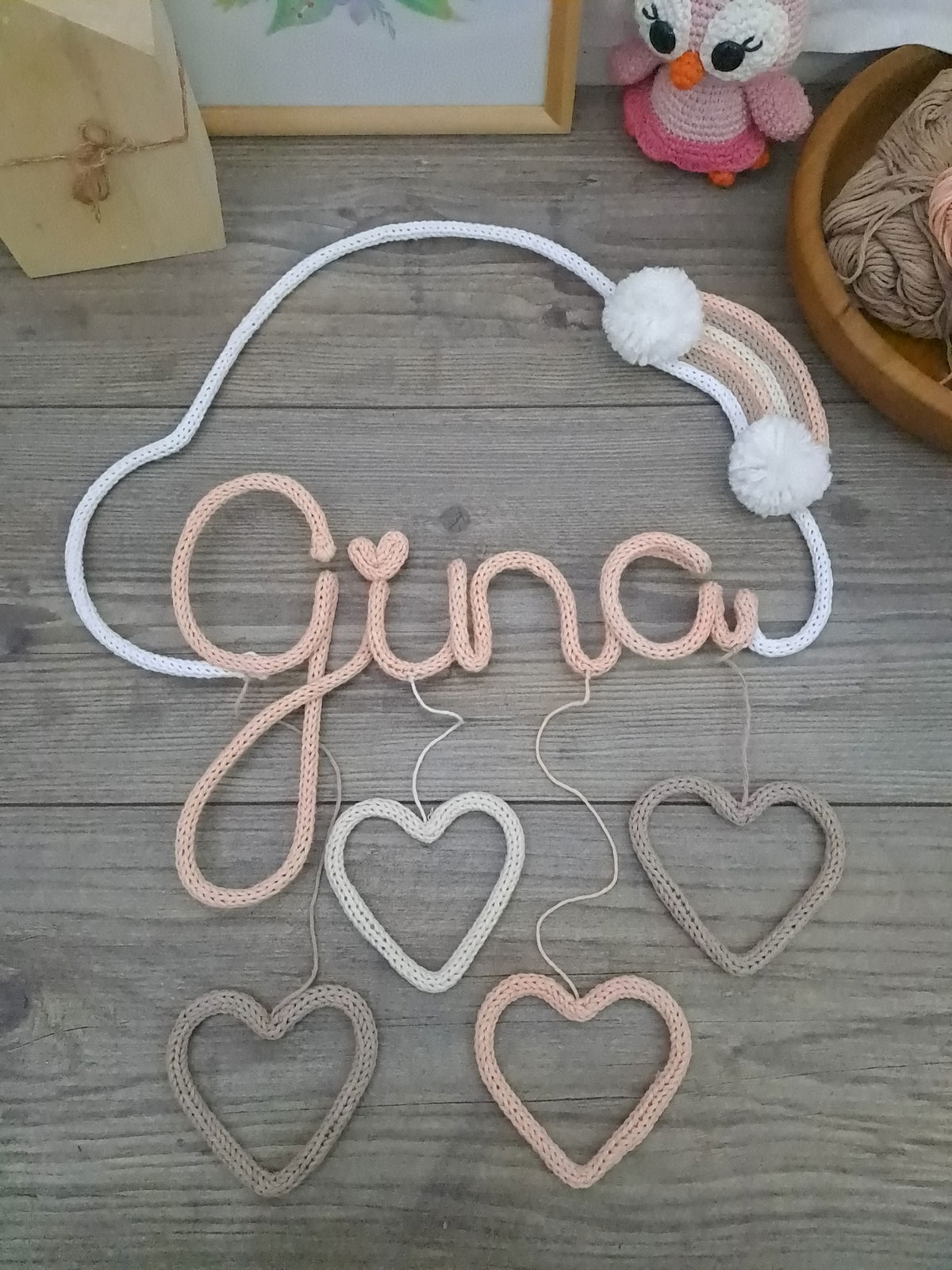 Adicional para los nombres de alambre forrado, correspondiente a una nube con un arcoiris al rededor del nombre, y 4 corazones colgando abajo.