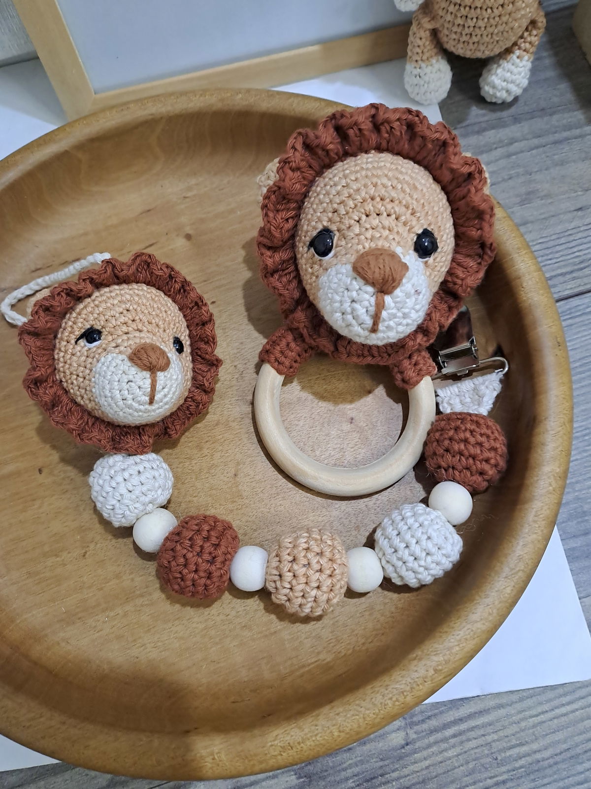 Portachupete con cabeza de león y pelotitas tejidas, con detalle de cuentas de madera.