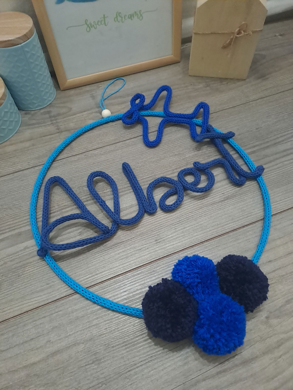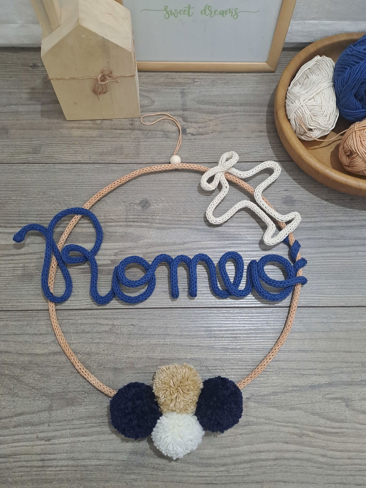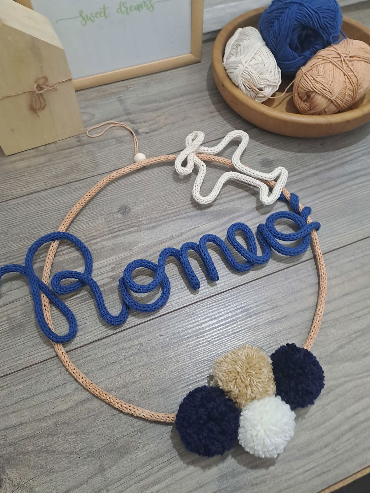 Nombre en aro de alambre, forrado con cordón de hilo de algodón.