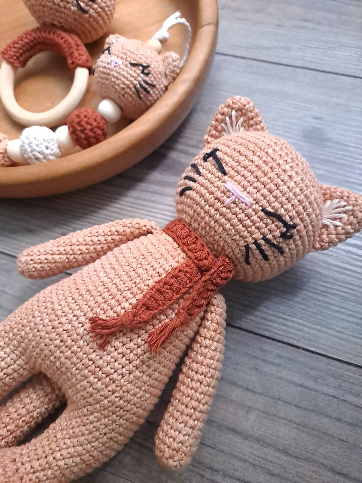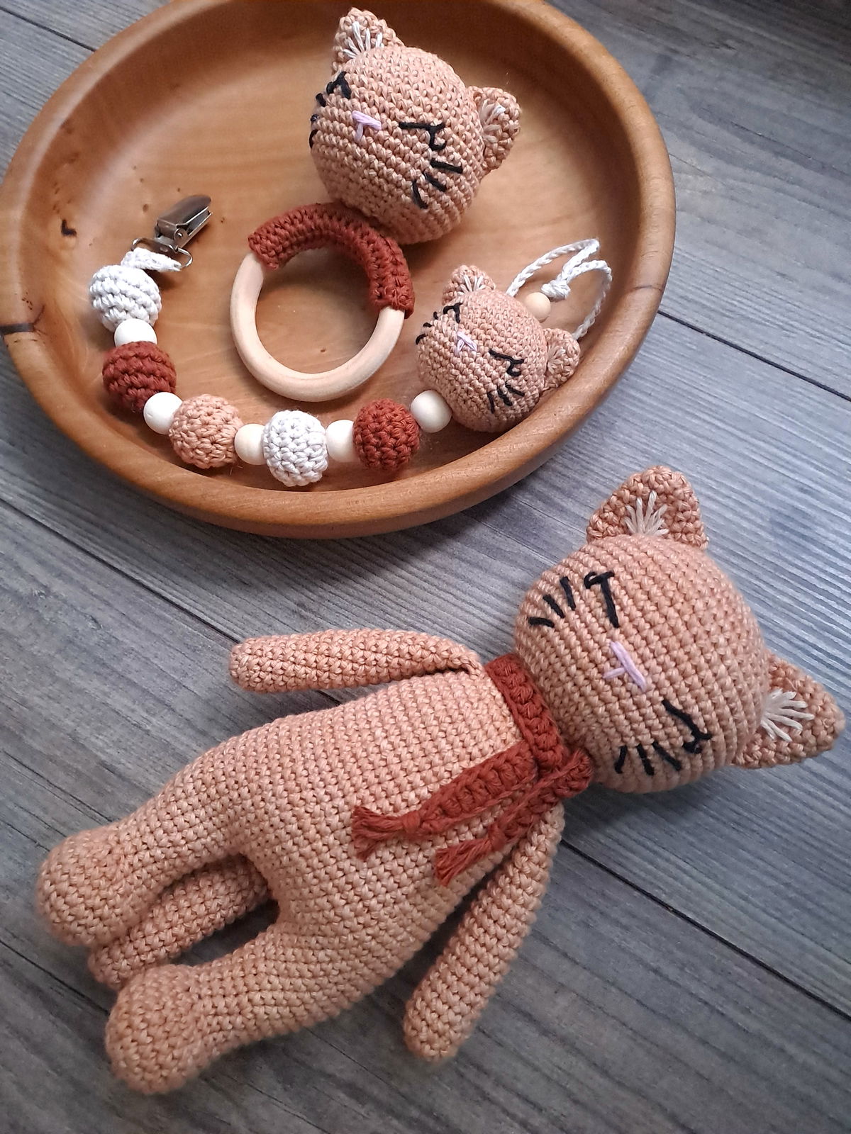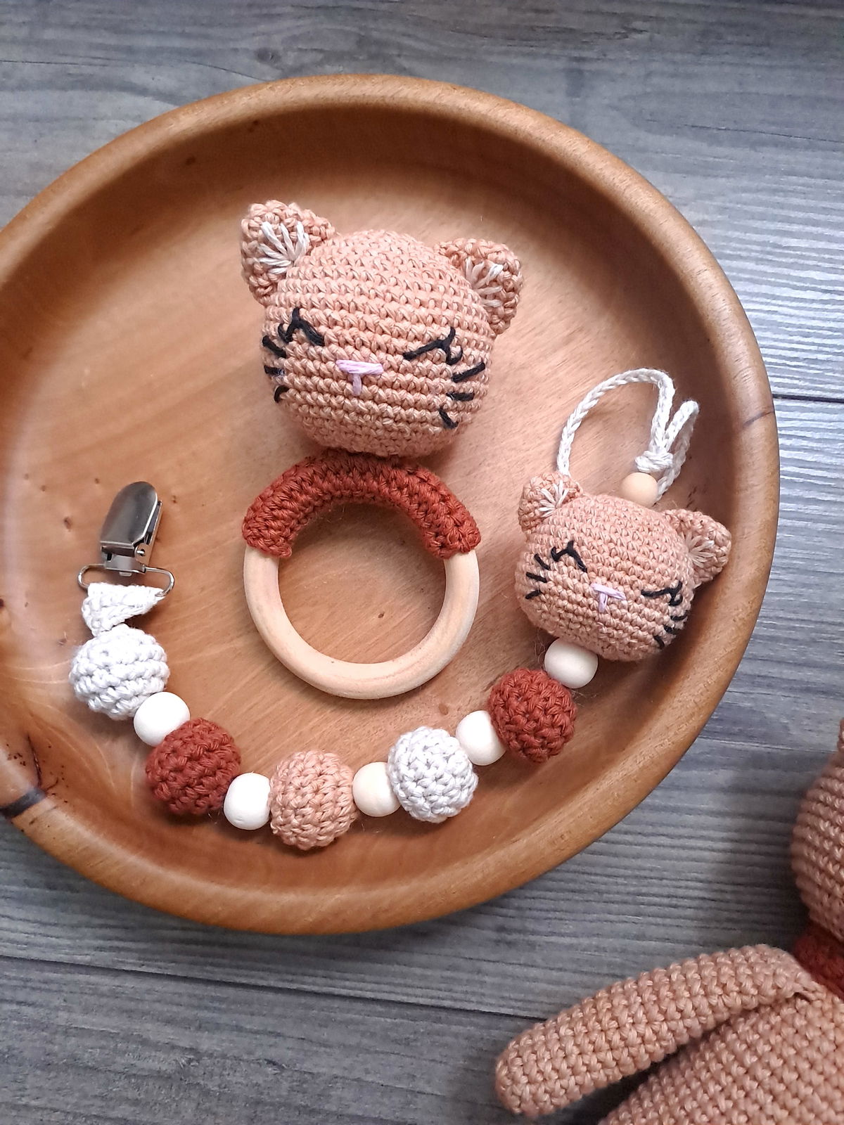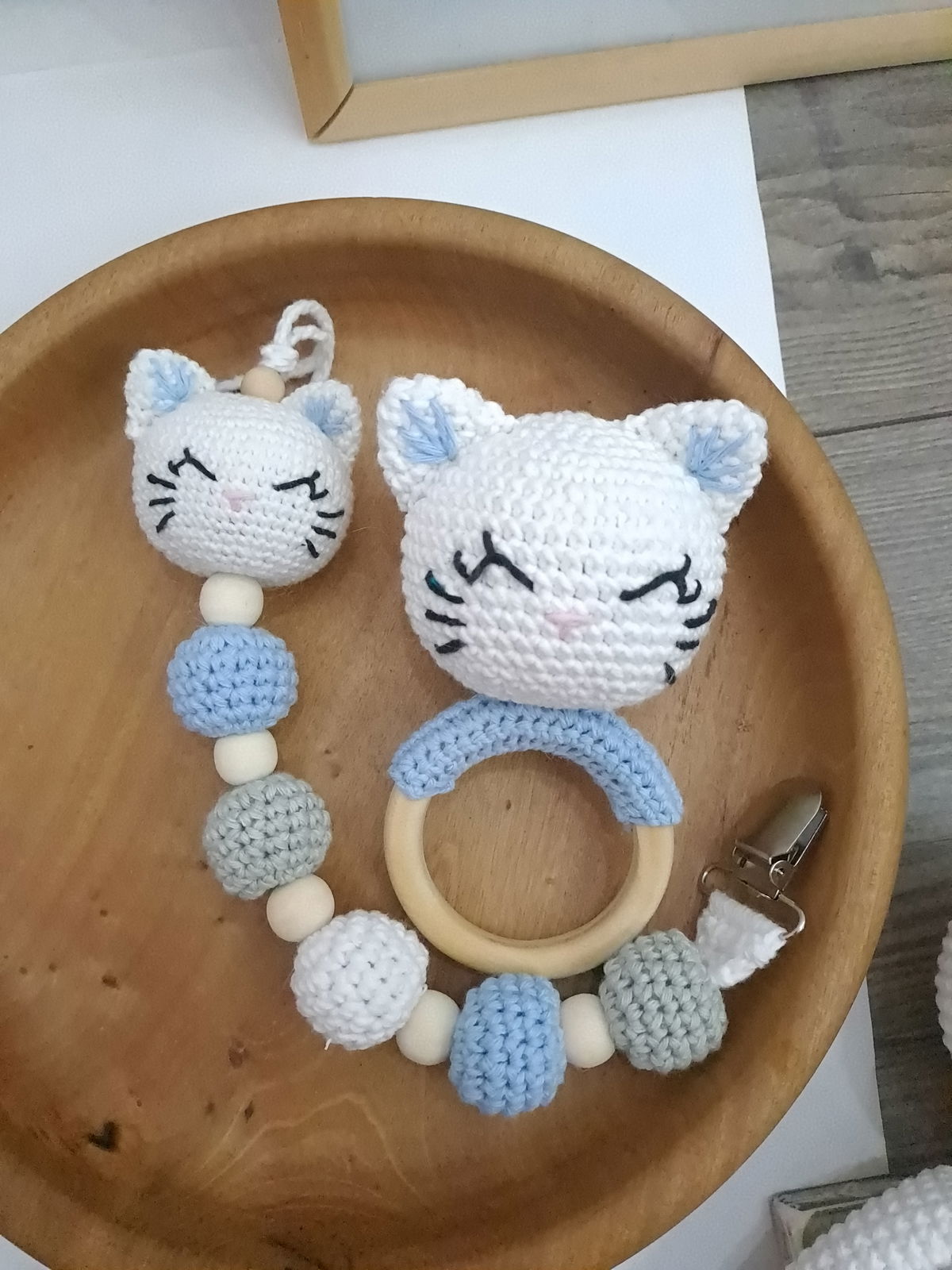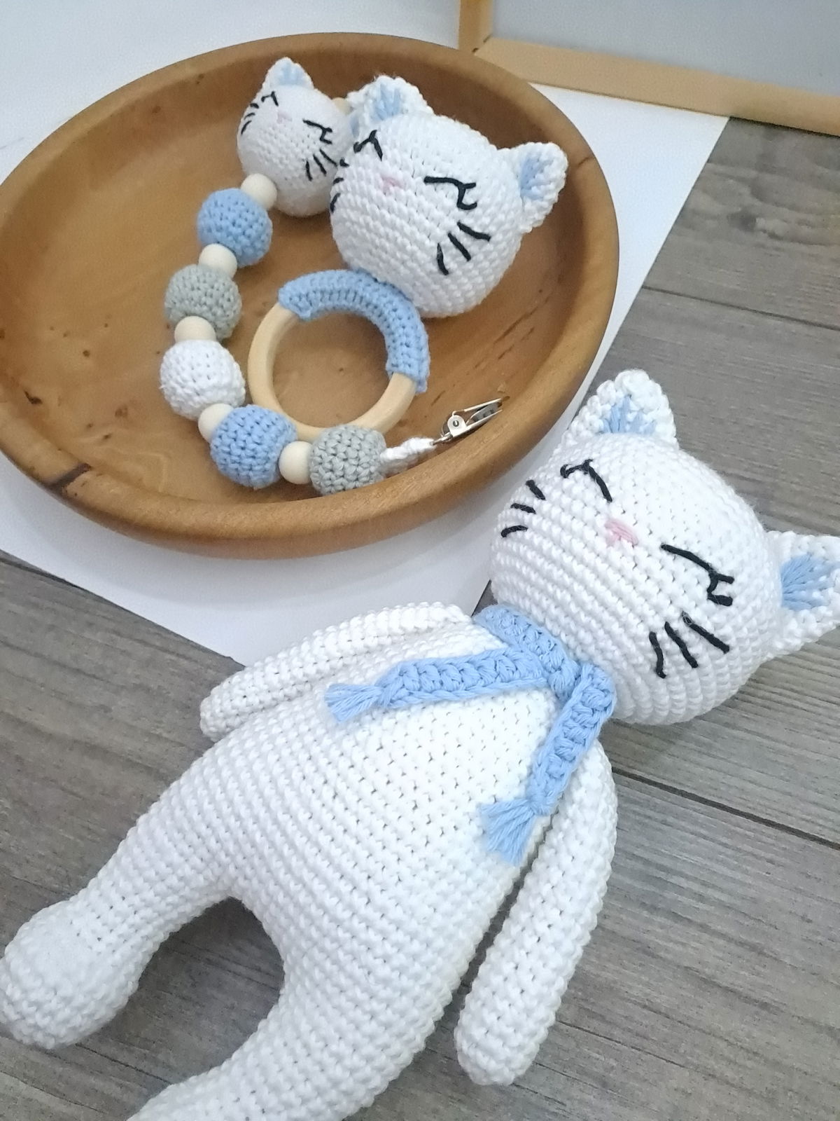 Set Gatito: muñeco de apego + sonajero + portachupete
