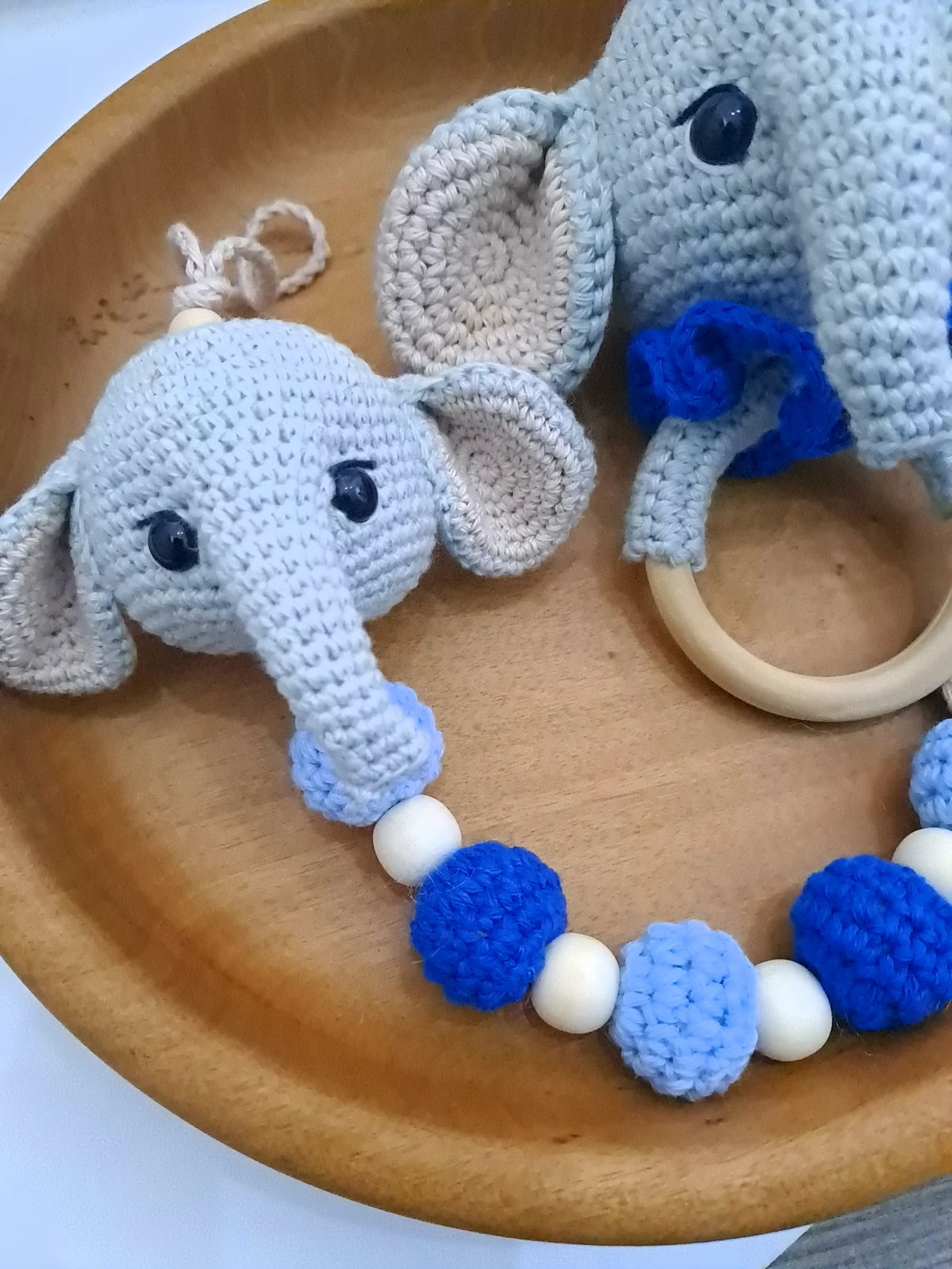 Portachupete: con cabeza de elefante y pelotitas tejidas, con detalle de cuentas de madera.