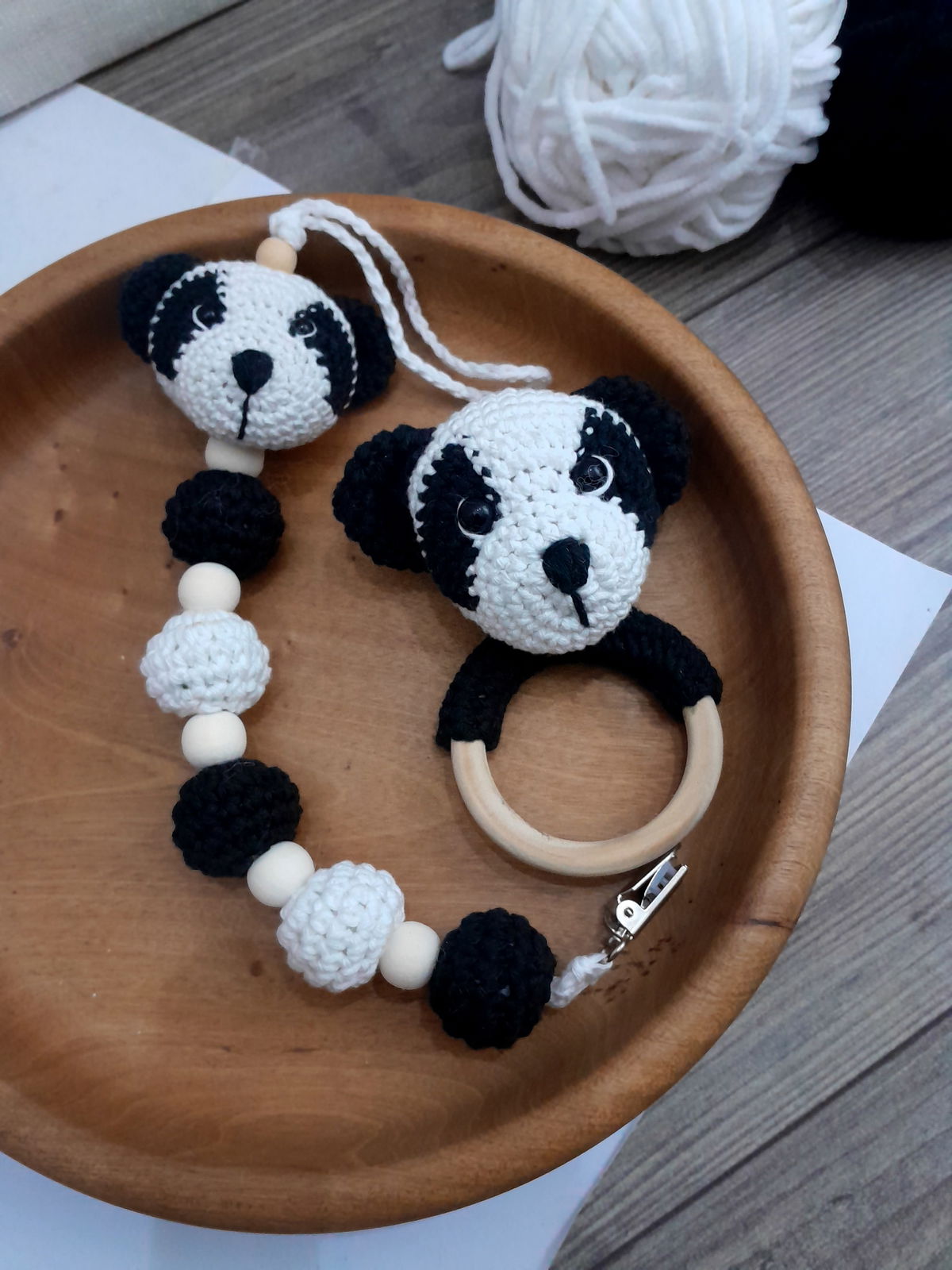 Portachupete con Osito y pelotitas tejidas, con detalle de cuentas de madera.