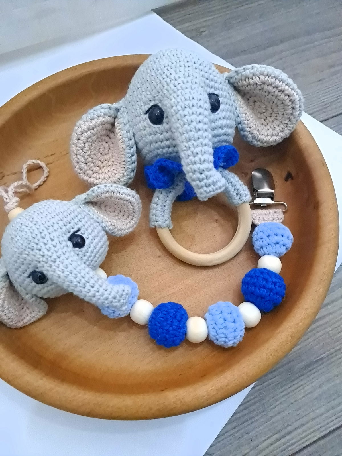 Portachupete con Elefante y pelotitas tejidas, con detalle de cuentas de madera.