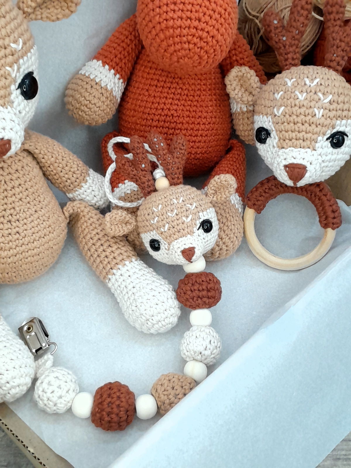 Portachupete con Ciervito y pelotitas tejidas, con detalle de cuentas de madera.